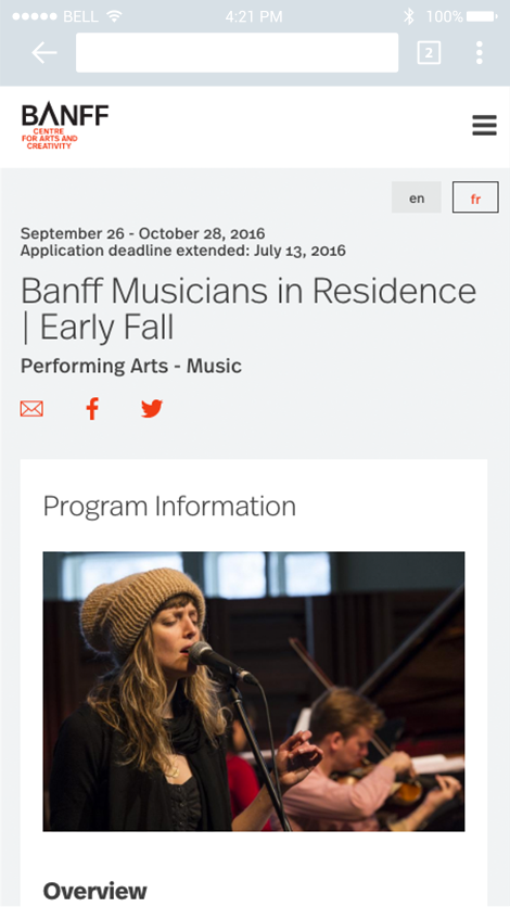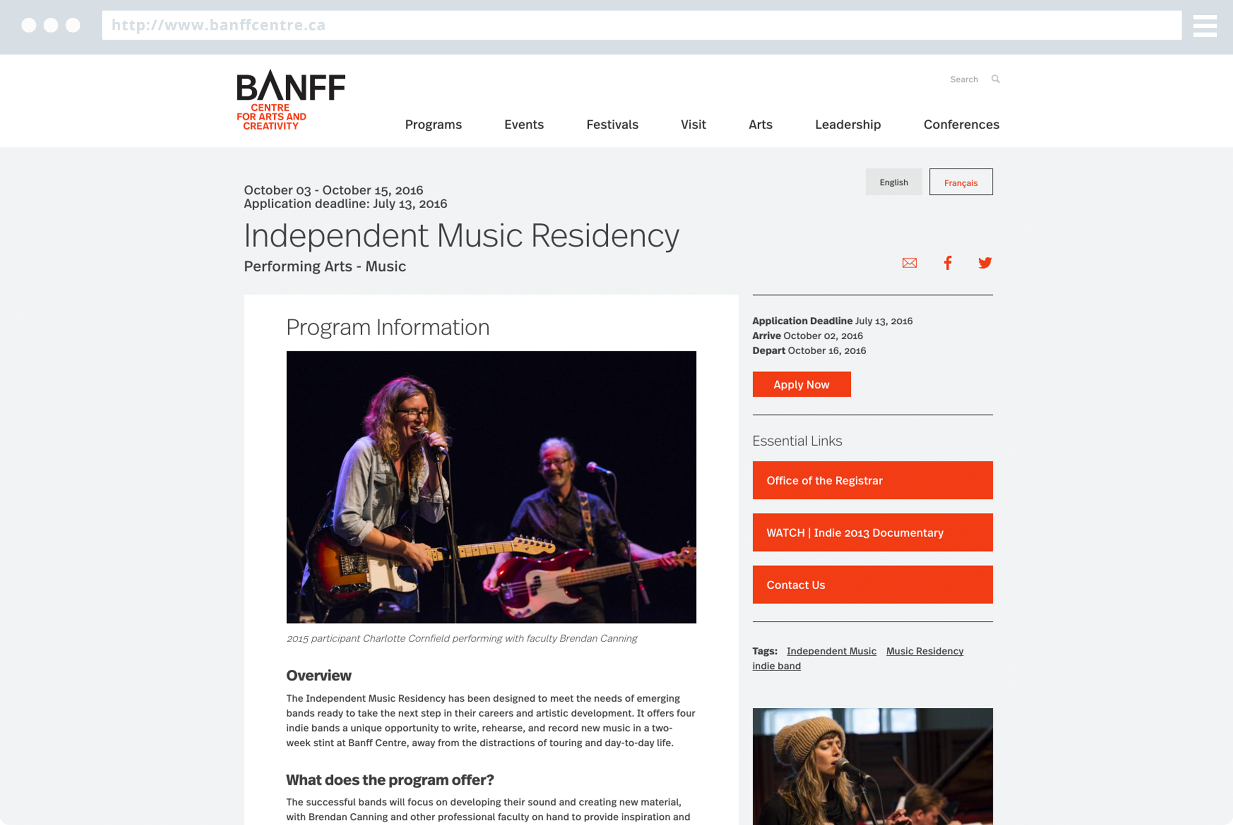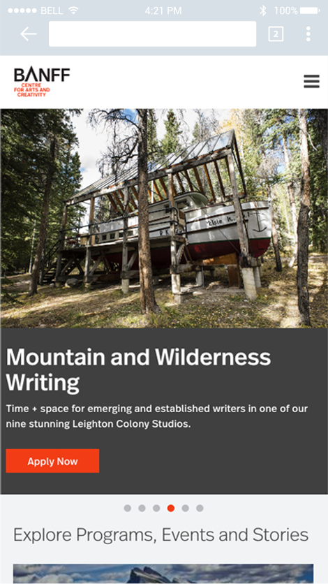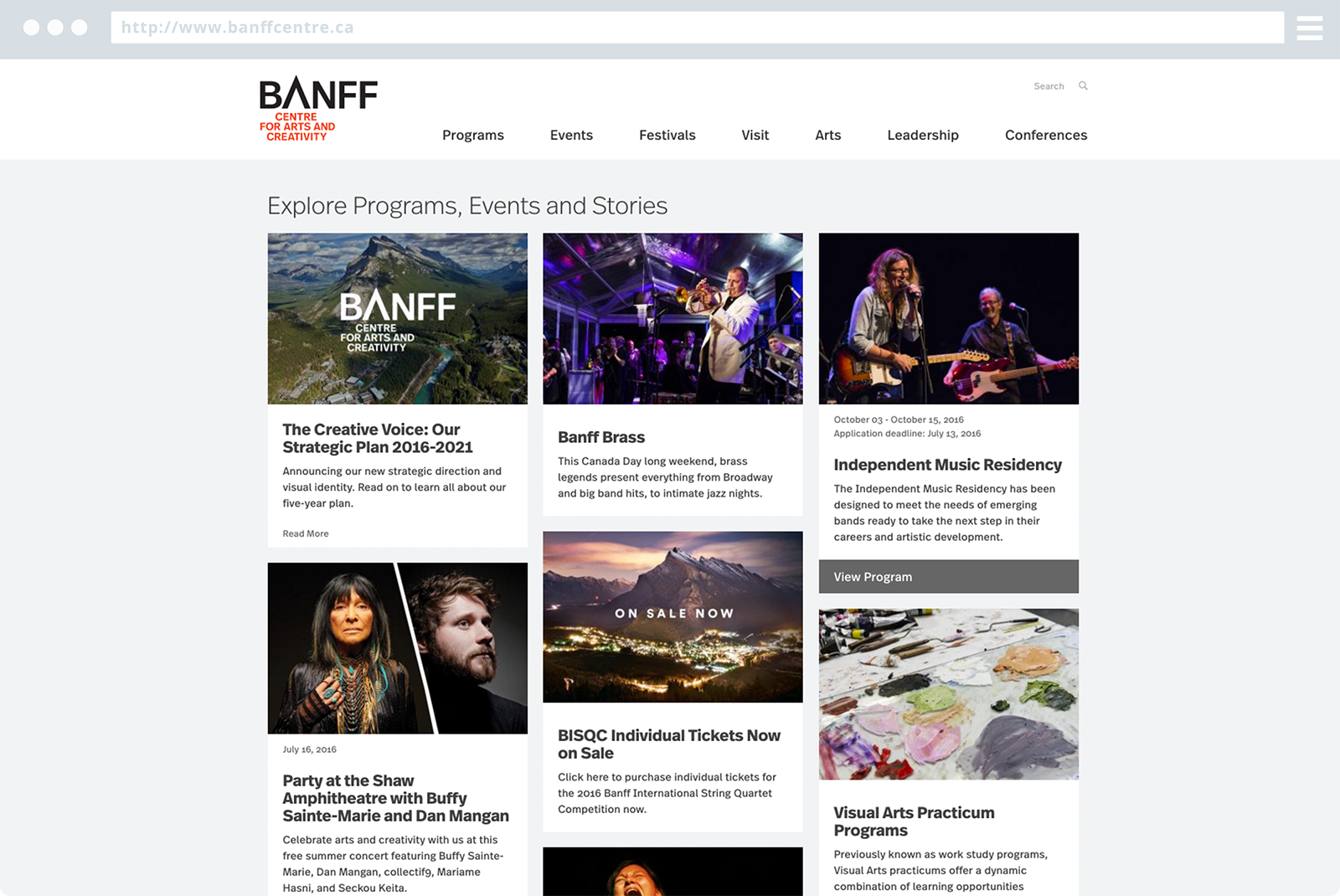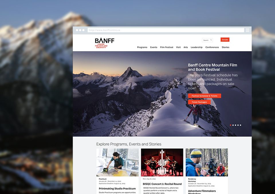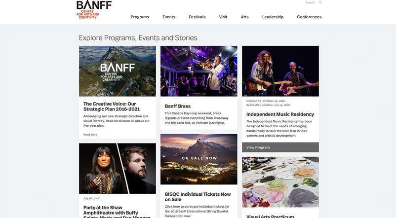 Intergalactic was approached by our client to revamp the new Banff Centre website to reflect the diversity of content produced by this iconic Canadian cultural institution and its members. The Banff Centre website highlights our build, brand and design interpretation capabilities. Intergalactic was responsible for brand interpretation, page design and all programming. Collaborating with Pentagram Agency, the site spring boards from their organization’s design refresh style guide and makes it a usable integration of function. Some key mandates included the inclusion of multilingual French/Canadian content to satisfy Heritage Canada’s requirements based on best practice.