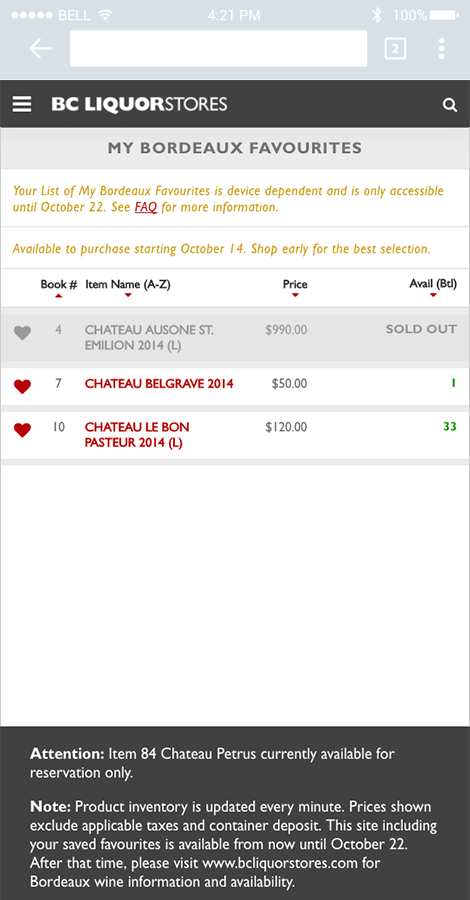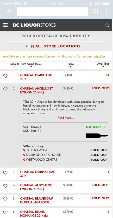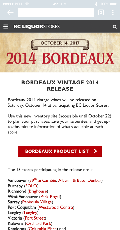 Intergalactic was asked by our longstanding client, BC Liquor Stores, to revamp a time consuming manual process and support the event with a responsive website/app that showcases the featured wines and availability so that customers could receive up to the minute results from sales and availability across all 13 stores for their favourite labels. In an event like this where product disappears in a blink of an eye, our resulting app and in-store signage relayed critical information about where to get the cherished bottles and how many were still in stock. Selection varies at each store and there are bottle limits for some products which our app helps to highlight. Previously, an easel and spreadsheet was updated at the front of each store to apprise customers of product status. With our mobile app data and in store 75” display screen at two flagship stores, visitors could add wines to the their favourite list; see status updates shift from “coming soon”, to “345 available”, to “sold out”; and focus their shopping efforts and strategize their plan of attack. This was a huge increase in visibility over just the printed booklet available in-store. Our app descriptions also included the important Wine Spectator and Wine Advocate ratings, which influenced the purchases of many, along with suggested "drink by" dates. Admin staff were able to make quick updates on the fly and keep the stock list relevant and useful through the event.