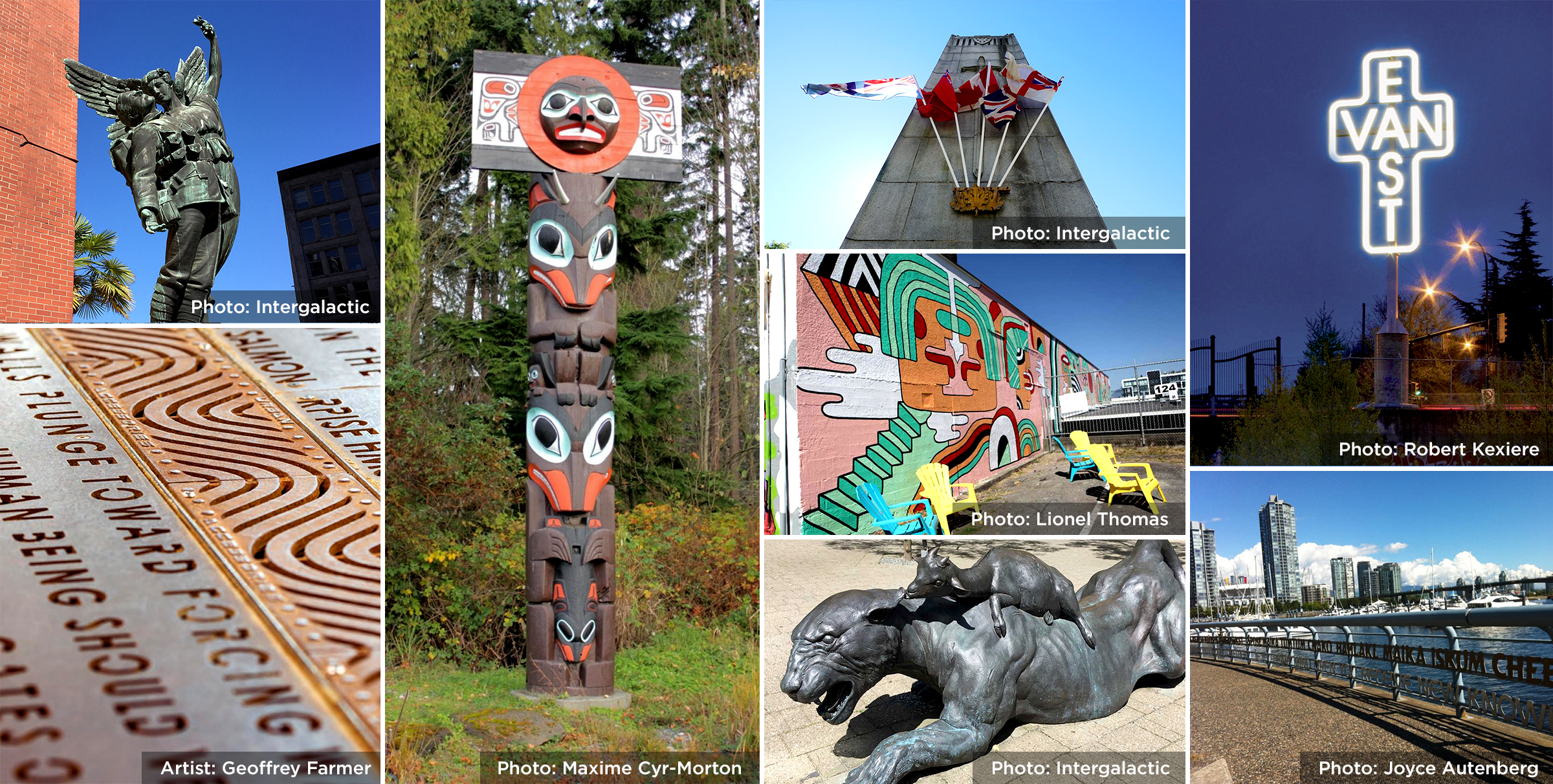 The public realm showcases excellence across a variety of public art installations; by emerging and established artists, in new and traditional media, and through award-winning commissions and artist collaborations. You will find murals, sculptures, memorials, mosaics, tapestries, paintings and a range of site-specific works that will enhance your visit to each of Vancouver's 24 neighbourhoods.