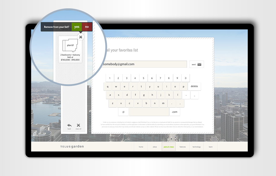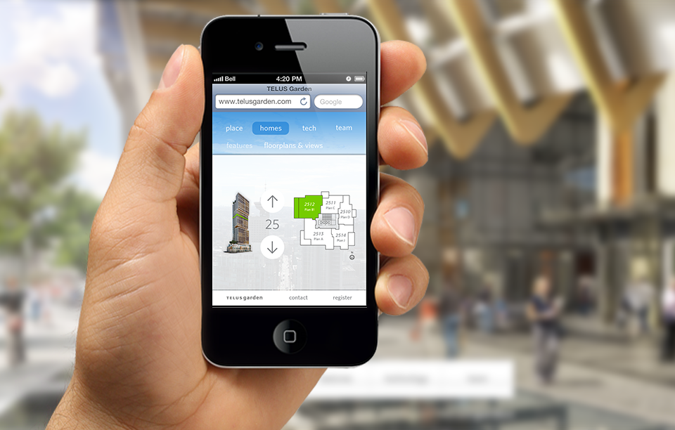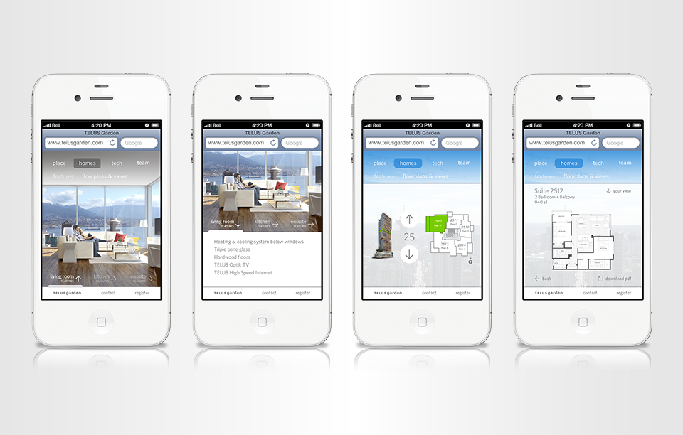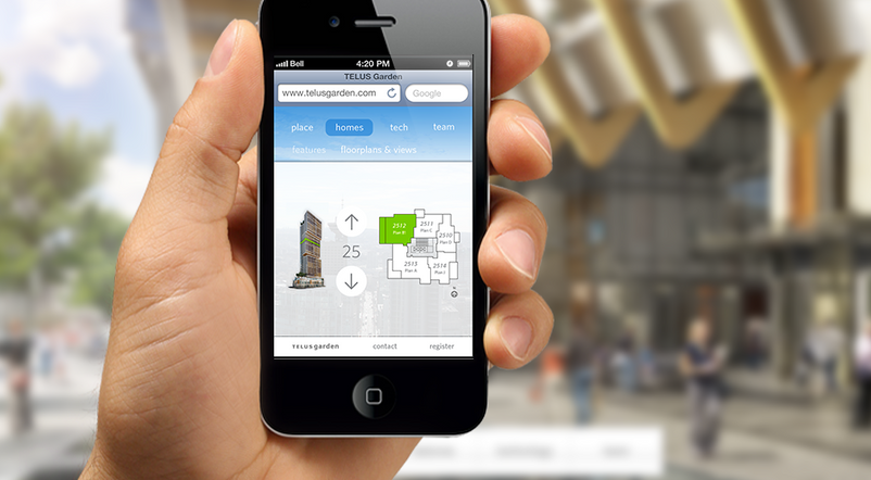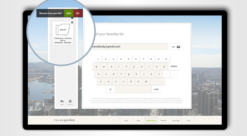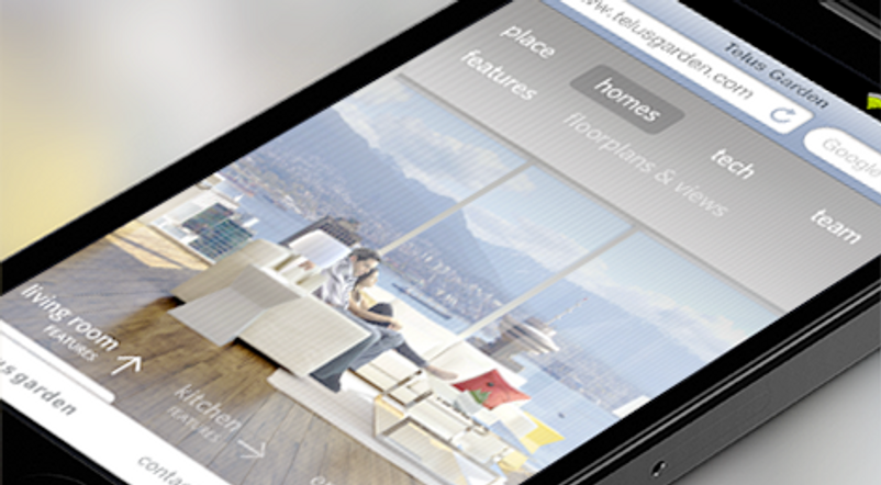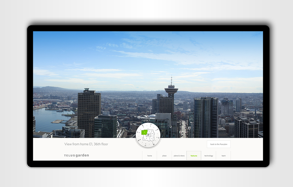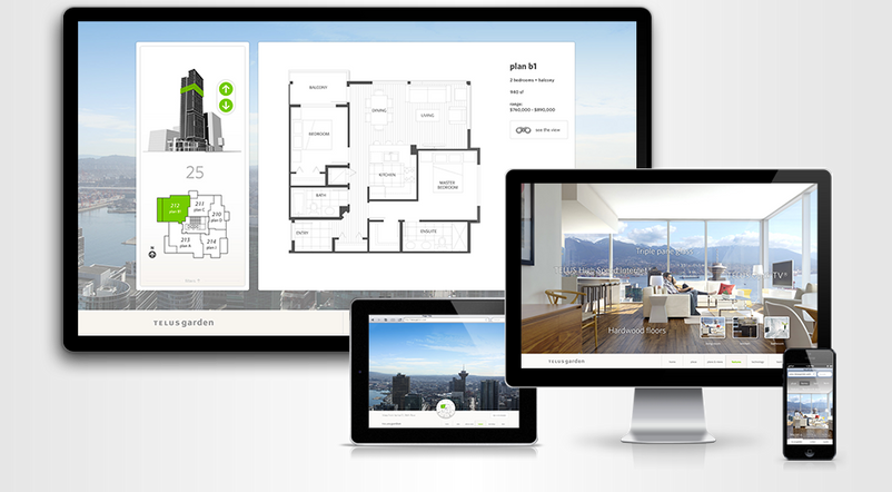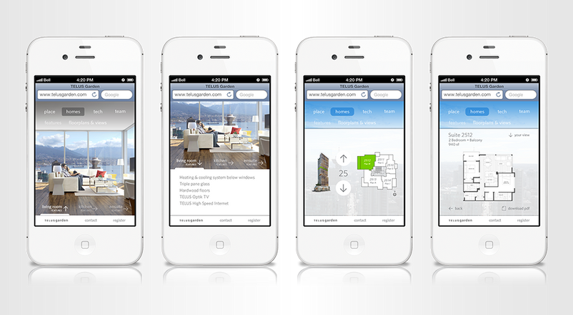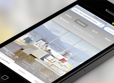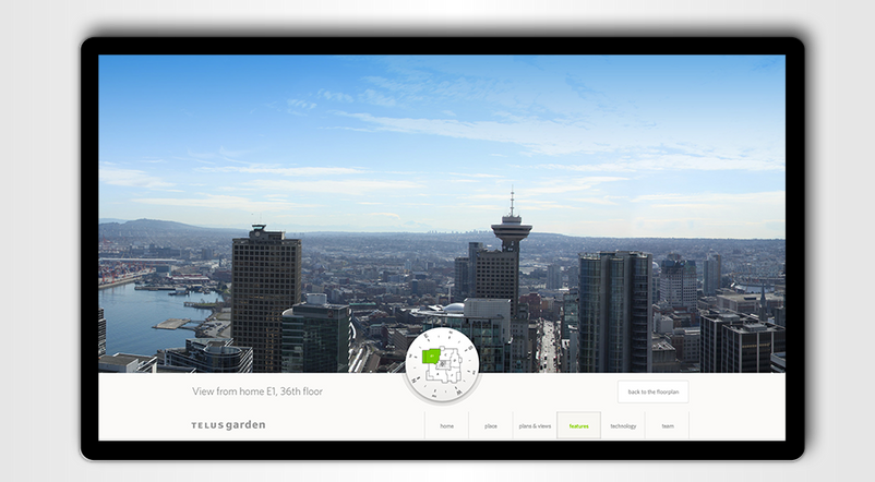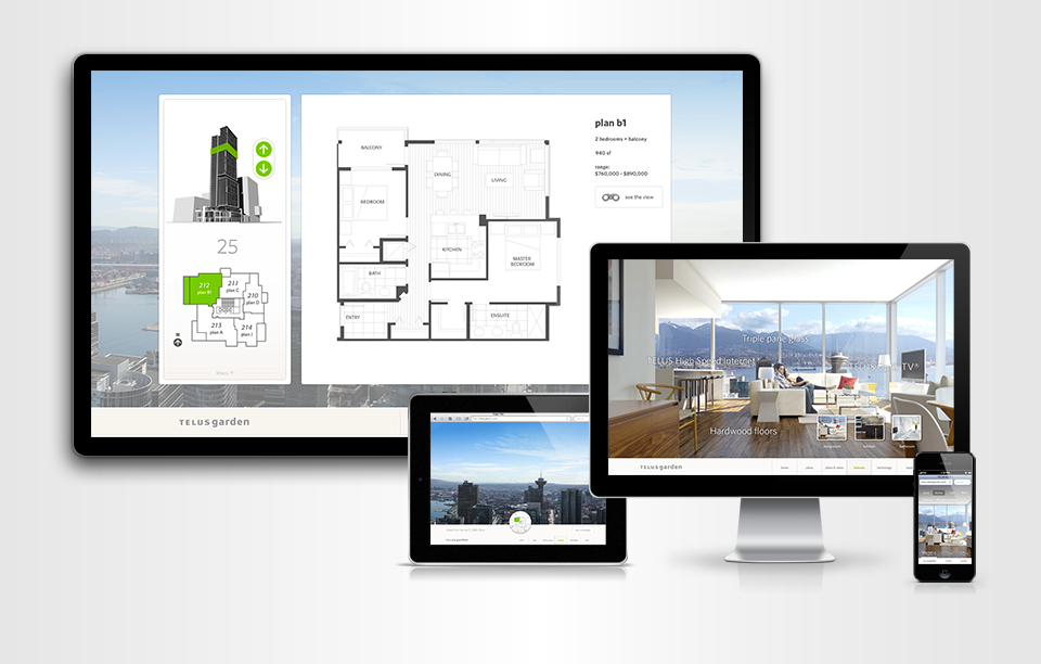 For Westbank and Telus, we conceived of an ecosystem of products for a sales effort, including a promotional commercial, touchscreen kiosks, a 12-screen video wall, desktop and mobile websites, and an iPad app.