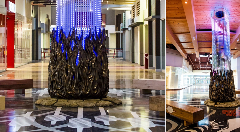The Central Hearth is an 18’ tall LED light pillar which displays a pre-programmed sequence of First Nations themed animations. Fabricated by our partners Eos Light Media and 3D Services, the column is comprised of 6000 individually programmable LED modules and a digital control system that allows the dynamic display of graphics, images. Intergalactic was proud to be able to work with Tsawwassen First Nations artists and facilitators to weave cultural themes into concept sketches & storyboards. The resulting vibrant animations play throughout the day and the motion graphics include bold Coast Salish figures of eagles, coyotes, orca pods, fire, and salmon woven into a mesmerizing display of literal and abstract sequences. The pillar is surrounded by a carved faux stone base and bronzed flame sculpture. Figuratively, this piece represents the central hearth of the longhouse, which is where the fire was kept alight and formed the focal point for the First Nations family.